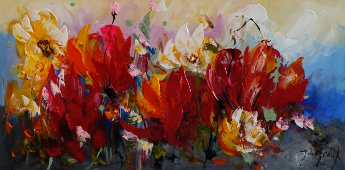 In het begin van zijn carrière schilderde Jochem de Graaf voornamelijk mensen, nu zijn de bloemen ook niet meer weg te denken uit zijn oeuvre. Hij schildert met reliëf waardoor hij diepte creëert in zijn kunstwerken. Zijn handgeschilderde olieverfschilderijen op linnen canvas zijn opgespannen op een spieraam. De zijkanten zijn mee geschilderd waardoor een lijst niet (meer) nodig is! De schilderijen zijn voorzien van een beschermlaag en ze worden geleverd met een ophangsysteem waardoor je ze direct op kunt hangen. Van dit schilderij hebben we maar één exemplaar. Onze schilderijen worden vaak binnen 48 uur thuisbezorgd. Wij hanteren een niet-goed-geld-terug-garantie. Bestel online en betaal veilig met iDEAL, of kom langs in onze winkel. De koffie staat al klaar!